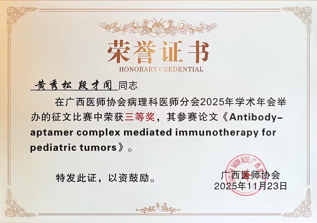 喜讯:我院病理科黄秀松、段才闻老师在广西医师协会病理科医师分会2025年学术年会征文比赛中获三等奖!