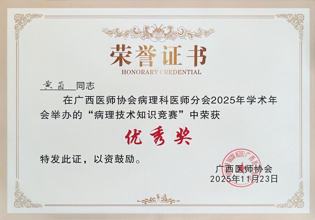 喜讯:我院病理科黄茵老师在广西医师协会病理科医师分会2025年学术年会“病理技师知识竞赛”中获优秀奖!